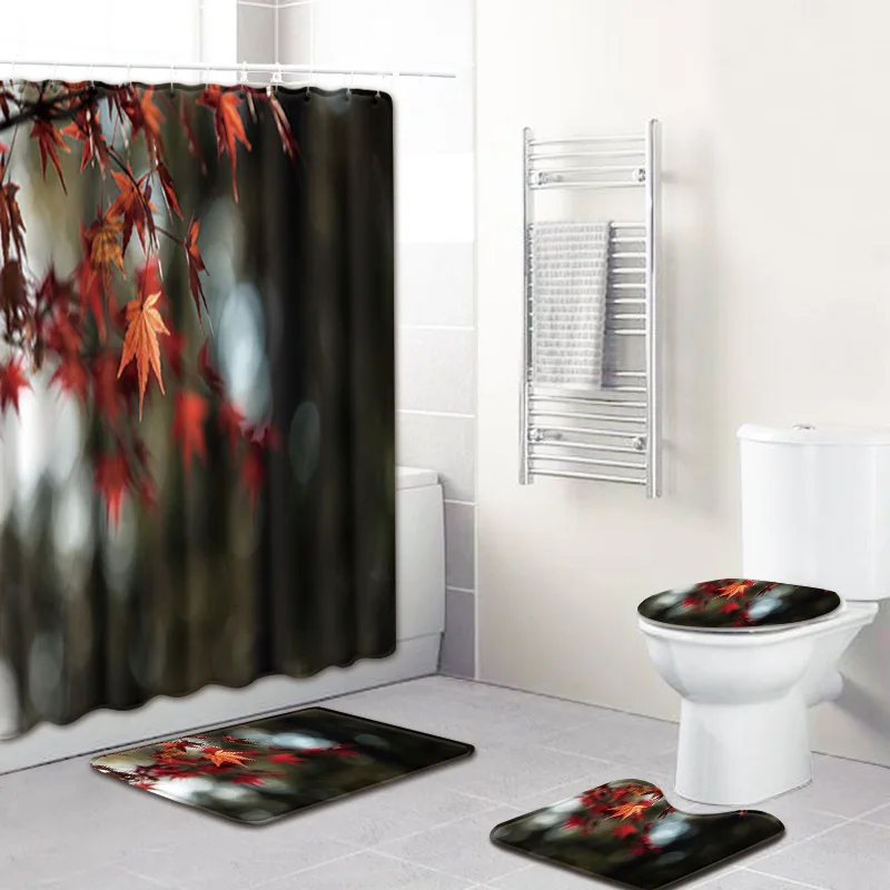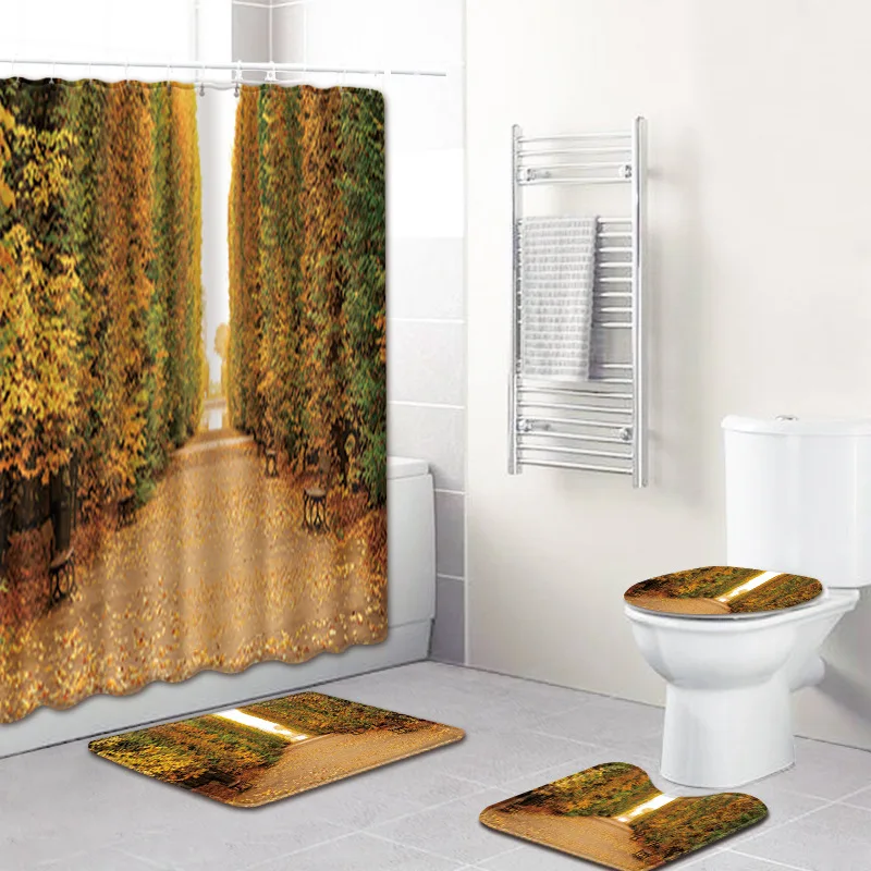 Landscape Bathroom Curtain Waterproof Fabric Shower Curtain Carpet Toilet Mat for Bathroom 4 Pieces